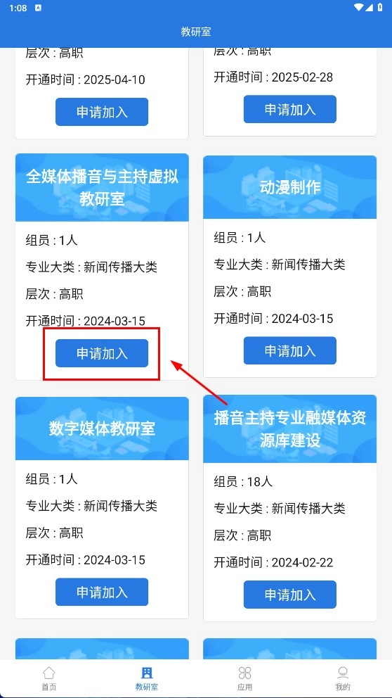 4、找到目标教研室(如【全媒体播音与主持教研室】),点击【申请加入】,完成教研室加入操作。