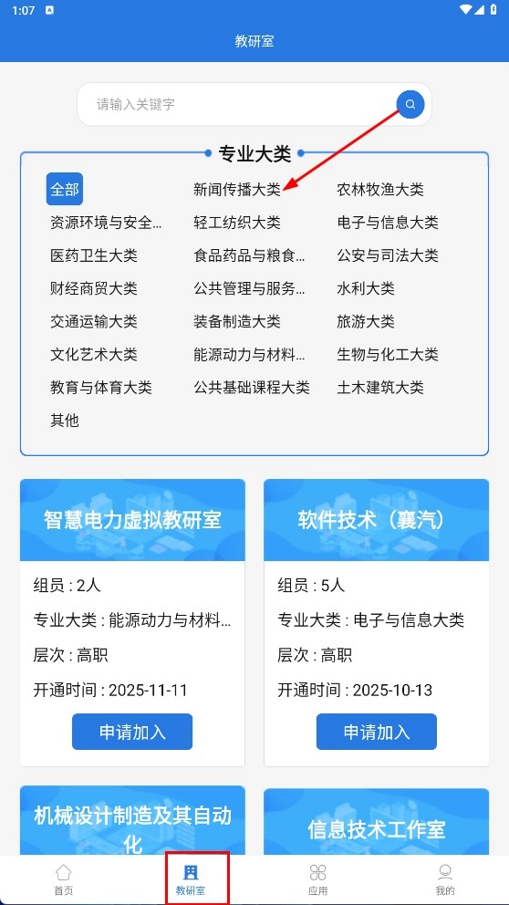 3、进入【教研室】,筛选【专业大类】,找到目标教研室,查看详情后准备申请加入。
