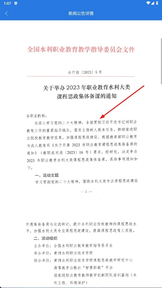 2、点击公告详情,查看【水利大类课程思政备课】通知,了解活动主题、主办单位等信息。