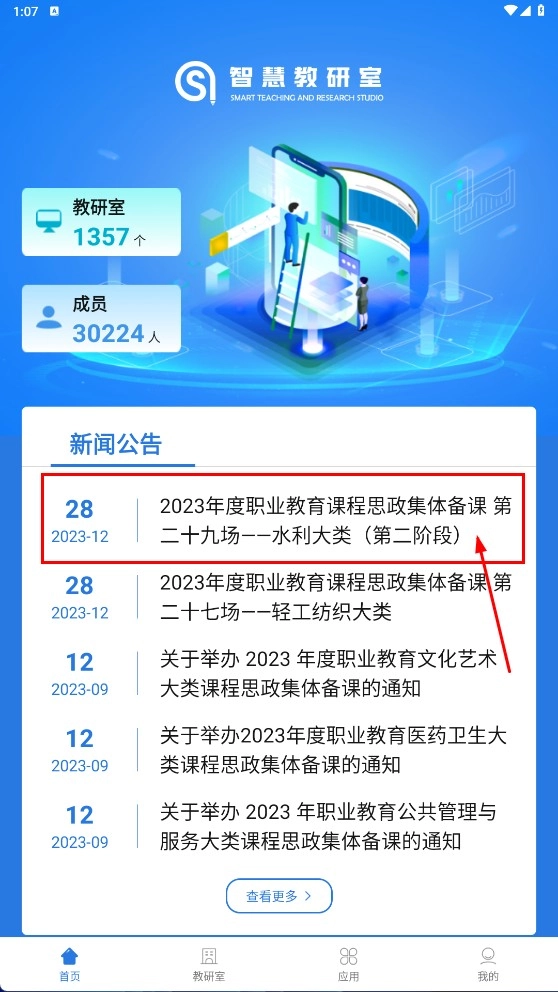 1、打开【智慧教研室】主页,浏览【新闻公告】板块,查看像【2023-1228】-【水利大类备课】这类通知,知晓相关安排。