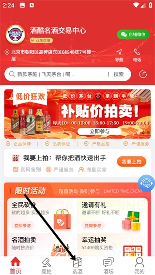 1、在酒酷名酒交易中心的首页,点击页面底部的【选酒】选项,即可进入选酒页面。