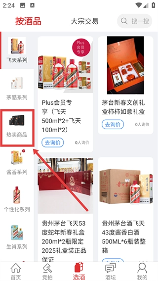 2、在选酒页面,点击左侧【热卖商品】分类,查看热卖酒品列表。