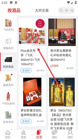 3、在热卖酒品列表中,选择目标酒品(如“Plus会员专享(飞天500ml*2+飞天100ml*2)”),进入酒品详情页面。
