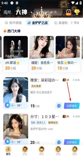 4、切换金铲铲之战分类,浏览该分类下的热门大神列表,找到合适的大神,点击立即组队,发起游戏组队请求。