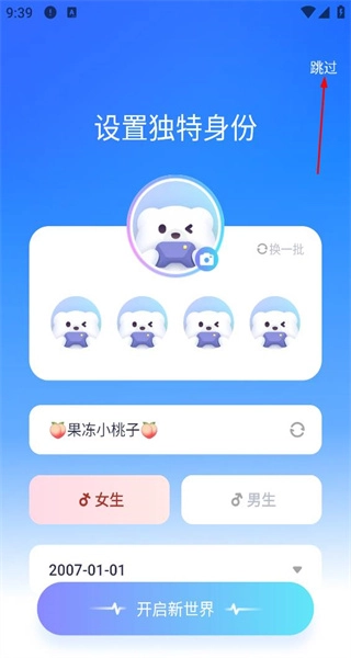 打开软件后,先进入设置独特身份的界面,这里会显示头像、昵称等相关设置选项,若无需设置,点击右上角的“跳过”按钮,即可直接进入软件的主界面。