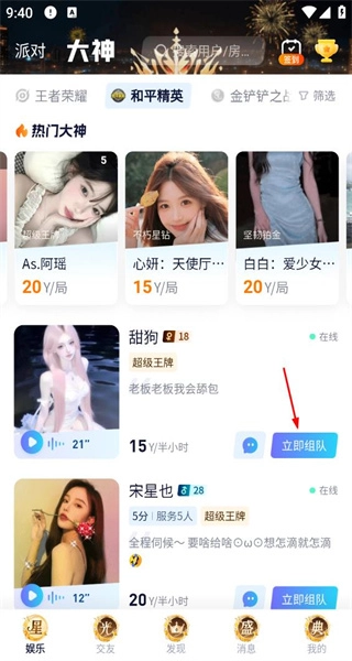 3、切换和平精英分类,浏览该分类下的热门大神列表,找到心仪的大神,点击立即组队,发起游戏组队请求。