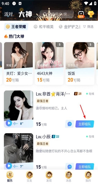2、在主界面选择王者荣耀分类,浏览热门大神列表,找到合适的大神,点击立即组队,发起游戏组队请求。
