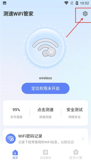 1、在【测速WiFi管家】的主界面上,点击右上角的【设置】图标,即可进入设置页面,此页面涵盖了各类功能选项。