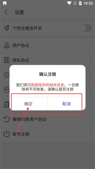 4、弹出【确认注销】弹窗,提示信息删除后不可恢复,点击【确定】即可完成账号注销操作。