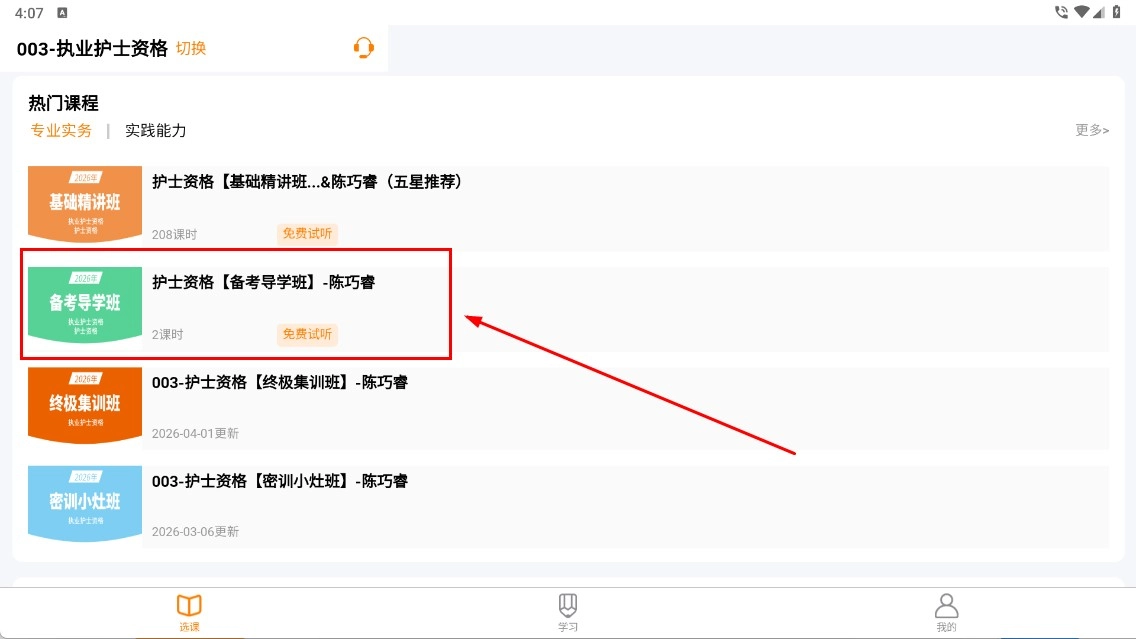 2、在选课界面,点击例如【护士资格(备考导学班)-陈巧睿】课程,进入课程学习页面。