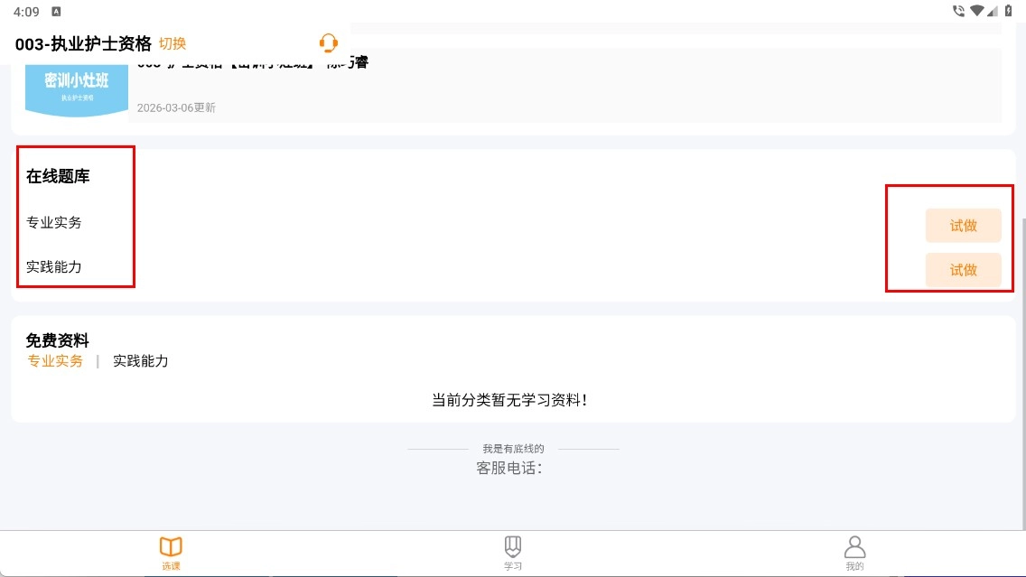 4、在学习板块,进入在线题库,选择【专业实务】【实践能力】题型,点击【试做】进行习题练习。