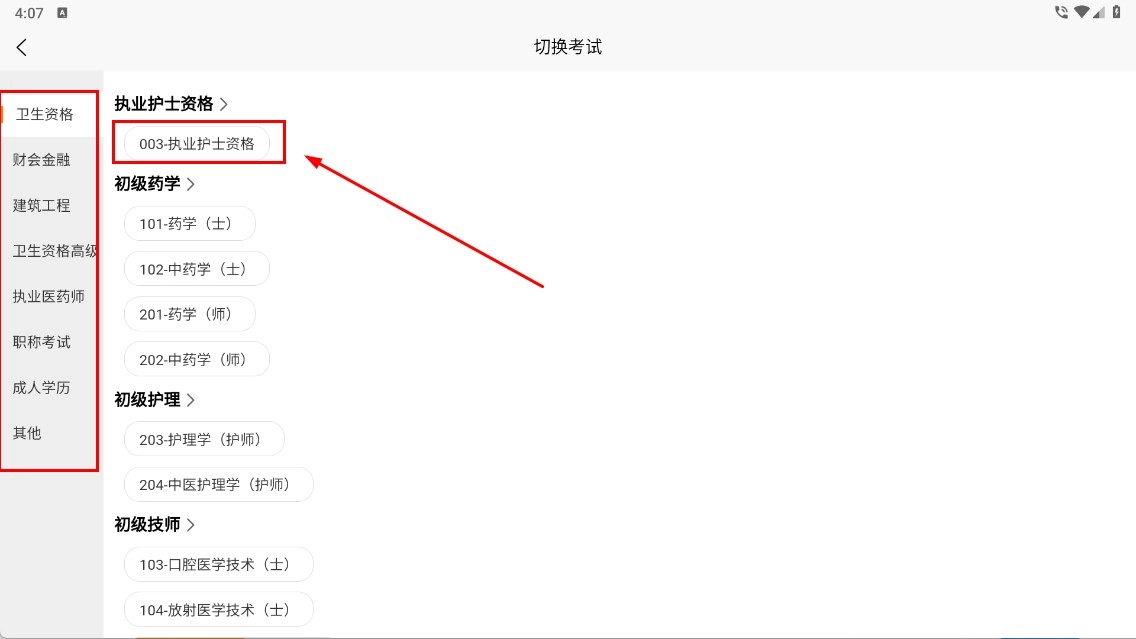 1、在考试切换界面,挑选像【003-执业护士资格】这样的考试类别,进入相应的学习板块。