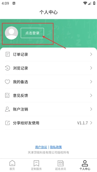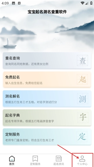 1、打开软件进入首页后,能看到【重名查询】【免费起名】等功能选项,点击底部的【个人中心】,即可进入个人相关操作页面。