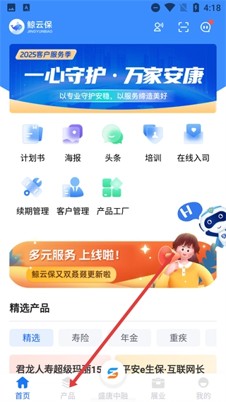 1、打开鲸云保首页后,点击底部的【产品】选项,即可进入产品页面。