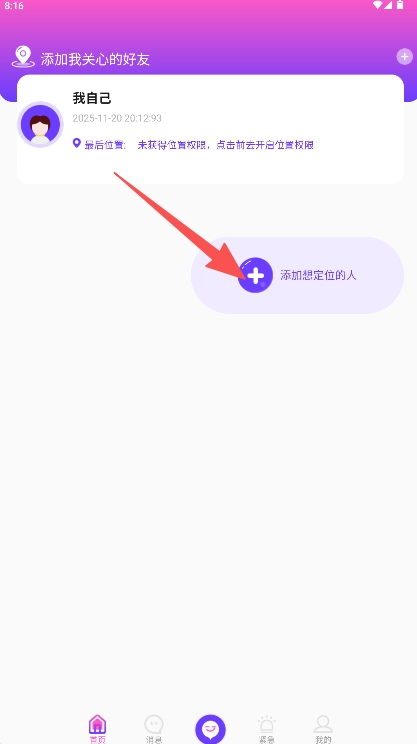 2、在首页点击“添加想定位的人”按钮进入好友添加页面。