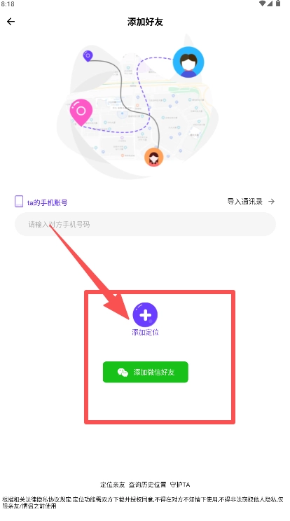 3、在页面输入对方手机号或点击“添加微信好友”邀请对方添加定位。