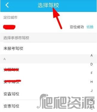 2、然后选择自己所在的城市和驾校,如下图: