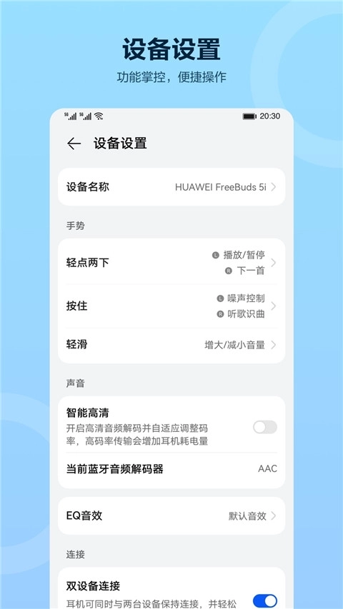 智慧音频是一款专门为华为蓝牙音频设备用户开发的管理软件,它不仅适配华为手机,也对非华为手机用户开放,能让更多用户体验到稳定高效的连接以及便捷的耳机管理服务。用户可以深度定制耳机音效,调节降噪等级,设置个性化的手势操控,使耳机更符合个人的使用习惯。