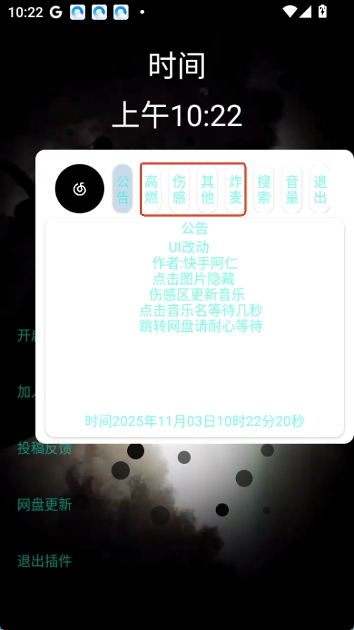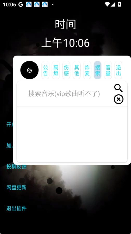 这款音乐插件属于聚合类音乐软件,界面设计简洁清爽。它无需登录即可直接使用,并且了多线路音源搜索功能,同时支持悬浮窗、用户投稿以及网盘更新等实用特性。该插件主要针对的是喜爱免费听歌,以及热衷于DJ/Phonk高燃串烧的用户群体。用户点击搜索按钮就能进行音乐检索,此外平台还按照高燃、伤感、炸麦等不同风格对歌曲做了分类整理。