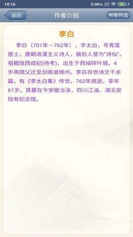 2.作者查找:根据748位古代诗人的名字进行查找,了解他们独特的创作风格和作品特点,增进对诗词的理解。