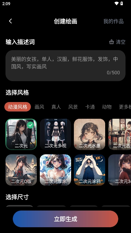 4、选择AI绘画,输入描述词,选择喜欢的绘画风格就能快速生成绘画作品