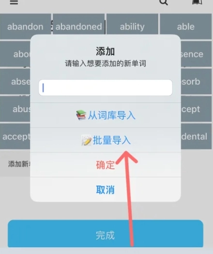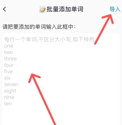 3、按照下面列举的示例输入添加的单词,点击右上角的“导入”即可