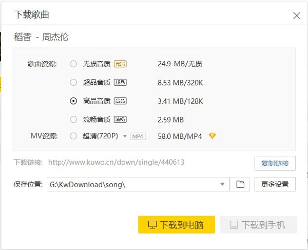 2、根据需求选择歌曲资源的品质,并保存至电脑或者通过数据线直接到手机里。