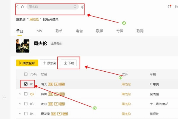 打开酷我音乐后,可通过歌曲名称或歌手名进行检索,找到目标歌曲后勾选并点击该歌曲。
