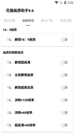 2、点击画质修改,玩家们可使用解锁16:9画质、解锁超高清、全部解锁画质、解锁超高音质、流畅+120+60帧率、超高清+60帧率等功能;