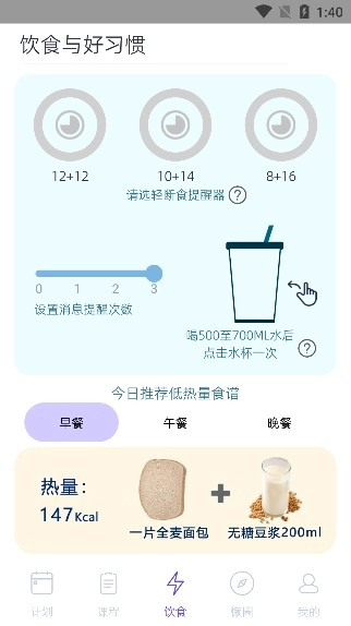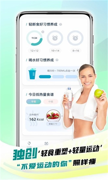 有轻断食计时器,喝水提醒,低热量食谱等饮食辅助功能,饮食健身双管齐下。