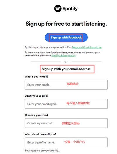 如果你选择电子邮箱注册,那么需要填写你注册用的邮箱账号,并创建spotify密码,然后,按照要求填写你的个人信息,包括昵称、生日、性别等。