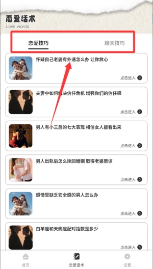 4、点击到底部的恋爱话术可以选择恋爱技巧还有聊天技巧。