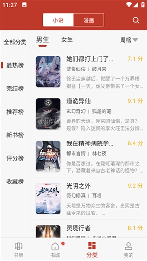 在这里除了普通的小说分类,还有“男生”和“女生”两个细分的分类,便于用户查找自己感兴趣的小说。