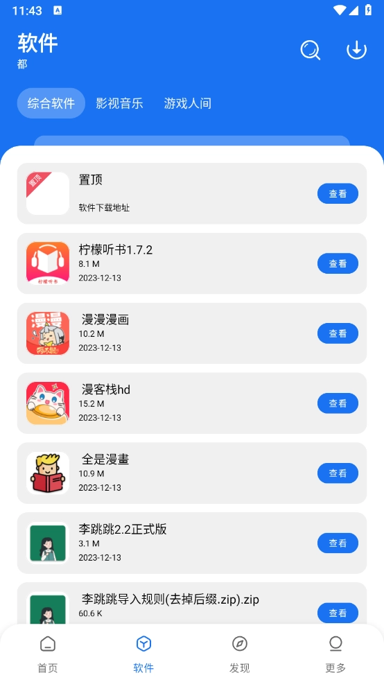 3、进入到“软件”板块,包括音乐、游戏以及影视等分类。