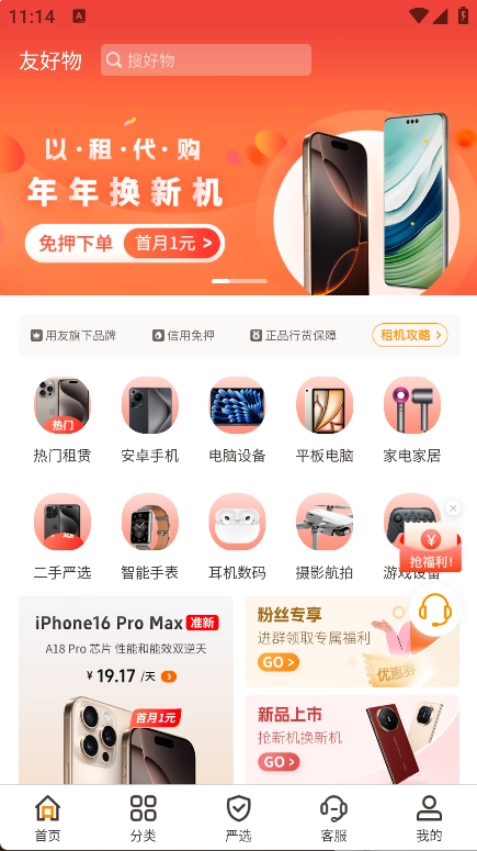 友好物是用友集团成员企业、友金所控股子公司打造的互联网智能硬件免押租赁创新平台。该平台秉持“以租代购、先享后付、共享共赢”的信用消费新观念,为年轻化、追求时尚与科技的优质用户群体提供服务,助力用户减少新产品的使用成本。平台具备信用免押、正品保障等优势,让用户在租赁时更安心。同时,其品类丰富且产品实时更新,能够满足不同用户的租赁需求。推荐有需要的用户选择使用。
