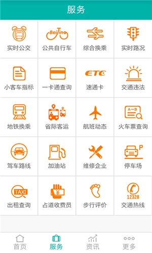 1、“服务”版块整合了实时公交、公共自行车、综合换乘、实时路况、小客车指标、一卡通查询、速通卡、交通违法、地铁查询、省际客运、航班动态、火车票查询、驾车路线、加油站、维修企业、停车场、出租查询、占道收费员、步行评价、交通热线等20项服务功能,全面优化市民的综合交通出行体验。对于习惯搭乘公交、地铁的市民而言,“北京交通”平台十分实用:既能查询公交与地铁的综合换乘路线、票价以及公交到站时间,又能实时掌握一卡通的使用动态,让公交出行更加便捷。
