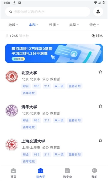 1、并进入软件,点击找大学。