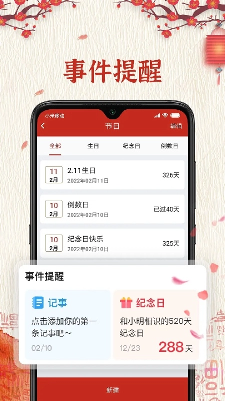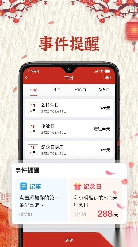 4、记事功能中分别规划了记事、纪念日、倒数日、生日;