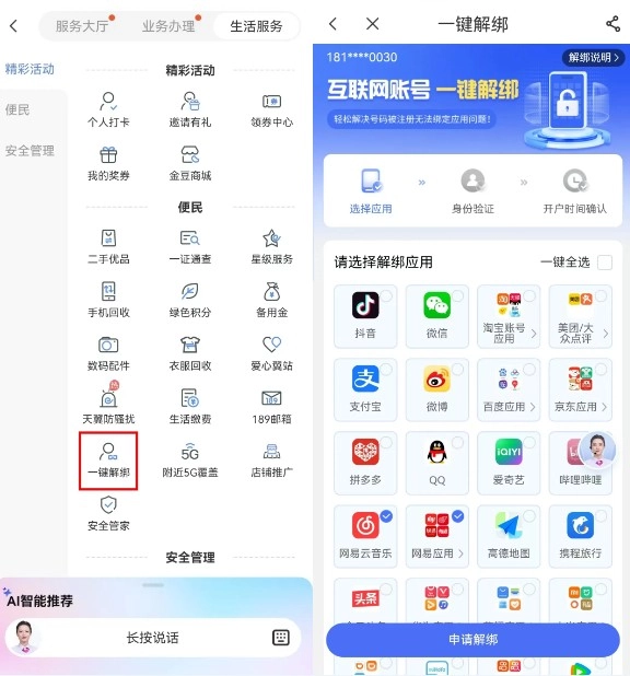 1、打开中国电信App,依次进入查询办理频道的全部服务页面,找到生活服务分类下的便民板块,点击一键绑定功能,然后选择想要解绑的应用。