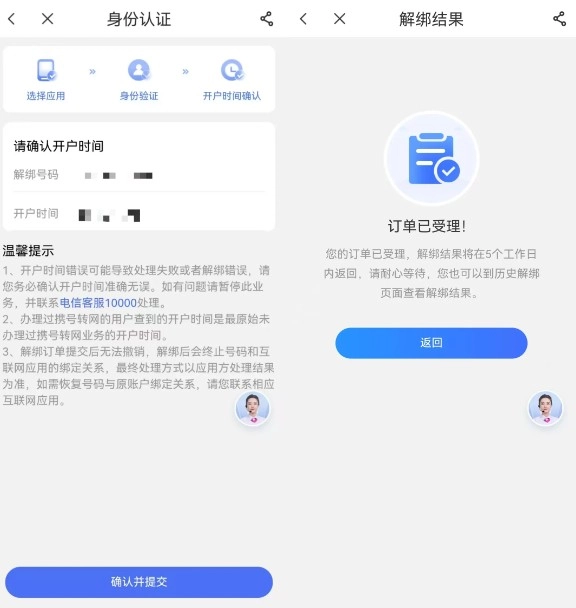3、确认开户时间后提交!解绑结果将在5个工作日内返回,也可以到“历史解绑”页面查看解绑结果。