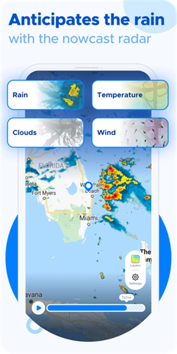 2、天气雷达。使用雷达图保持领先地位。从三种雷达地图类型(平面,球形和蝶形)中进行选择,并在四种雷达图层中进行选择:温度,风,雨和湿度。
