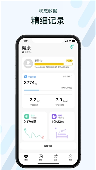 5、记录您的运动数据:计算目标是否达成,步数,距离,卡路里消耗等。