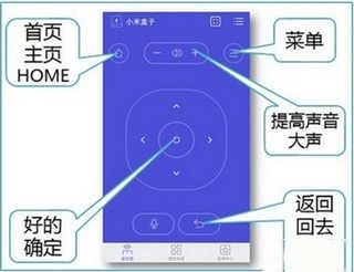 3、小编就以小米电视为例,点击“小米电视”,可以看到软件的主界面,非常简洁,常见的选择键、确定键、菜单键、主页键、返回键、音量键,下方是功能选择栏,右上方分别是切换手势遥控器和更多设置按钮