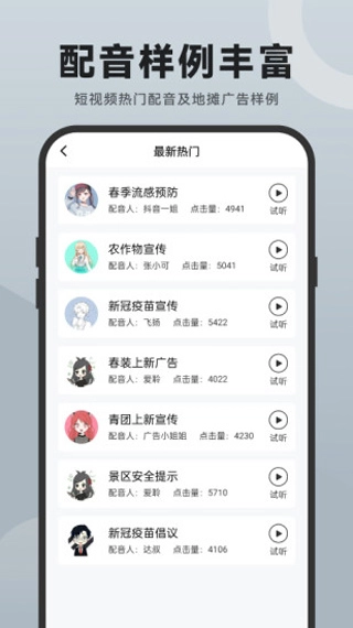 3、海量示例模板:广告促销,自媒体配音,解说,广播,来电提醒,企业宣传,语音提示等等,给你最直观的样音效果感受
