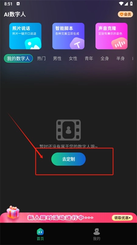 3、然后在主页我的数字人页面,点击去定制,根据自己的需求进行定制即可