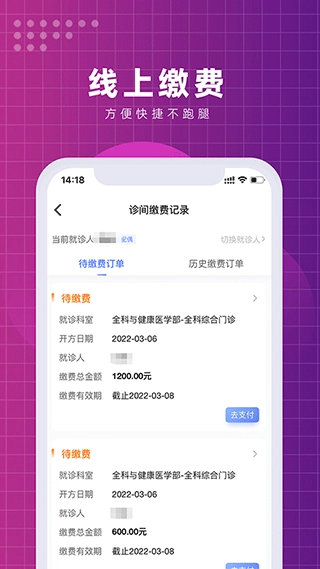 诊疗过程中开具的缴费订单,可通过完成快速缴费