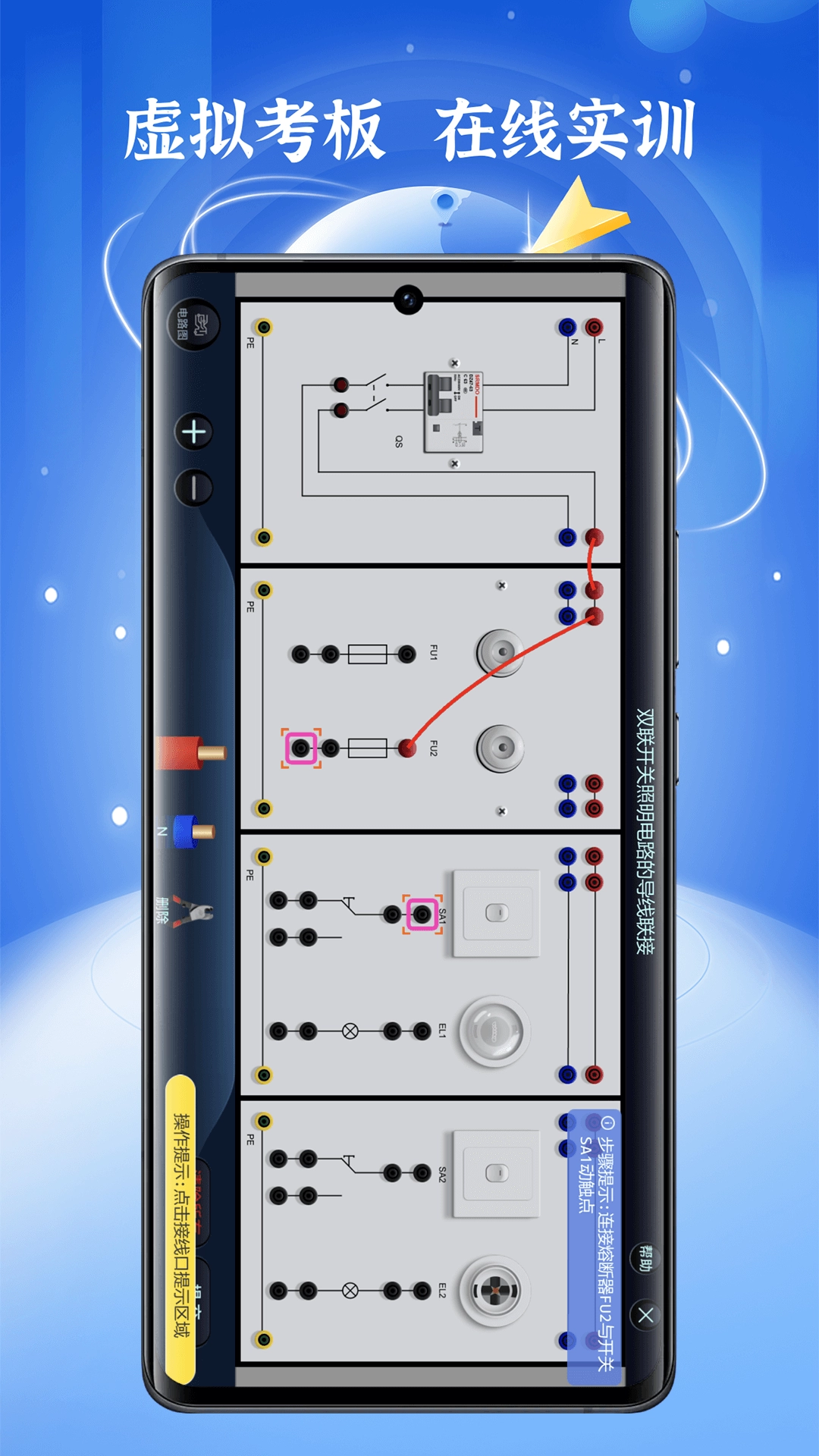 全新打造接电考板实操模式,打破传统刻板教学,设计出虚拟仿真考板,结合不同模块的控制电路接线,通过接线教学,自由练习以及实操模拟考试等,让用户对实操接线考板原理有更深入的学习和具体操作。
