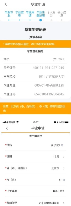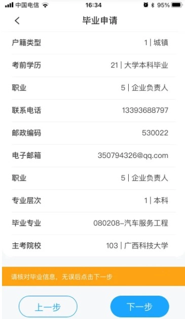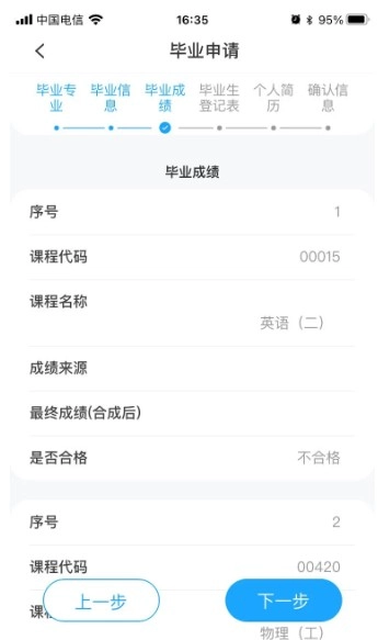 6、查看专业课程是否全部合格(没有合格成绩,则需要有顶替、转入或单科合格证等信息);点击下一步,填写毕业登记表信息,然后点击下一步