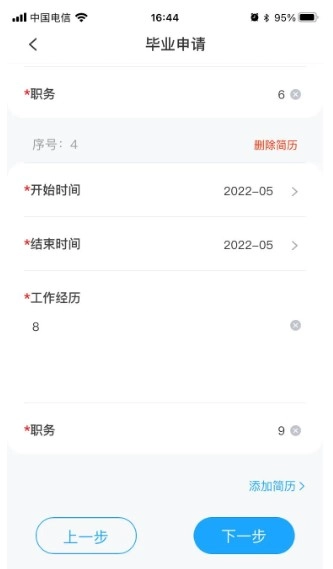 9、填写简历信息(点击【添加简历】添加新简历;点击【删除简历】删除当前简历),点击【下一步】