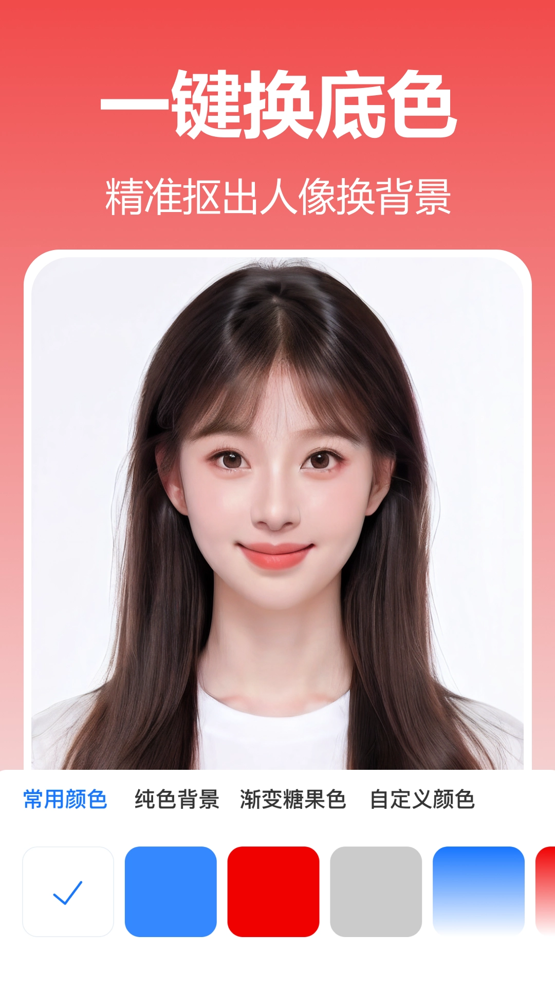 6.背景换底:从五大经典底色(如红、白、蓝等)中选择背景颜色,一键替换照片背景